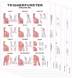 "Triggerpunkter," 5 stycken planscher visar 60 bilder med ett urval avkroppens vanligaste triggerpunkter: huvud-hals-nacke, skuldra-bål, säte-bäcken, arm och ben. Passar studenter som studerar anatomi, massörer, läkare, sjuksköterskor, sjukgymnaster, naprapater, samt friskvårds- och idrottspersonal.
